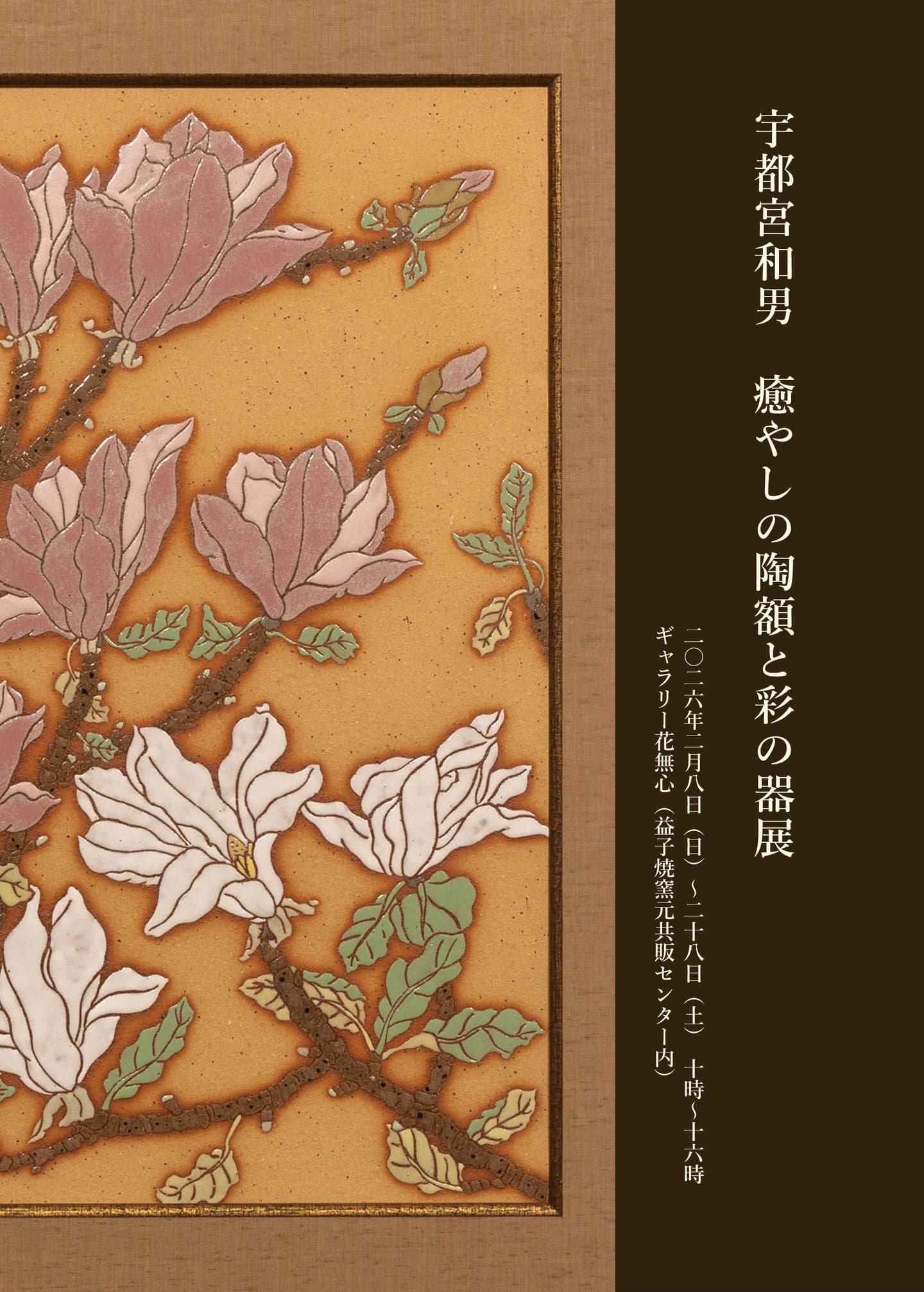 宇都宮和男 癒やしの陶額と彩の器展 宇都宮和男 癒やしの陶額と彩の器展 2026年2月8日(日)~28日(土) 10時~16時ギャラリー花無心(益子焼窯元共販センター内) ご挨拶今年も又、不穏な年明けとなりました。我々が乗る“宇宙船・地球号〟の舵取り、しっかり操ってくれる人がいるのかな?宇都宮和男 展示会図録 Download ◀ Home